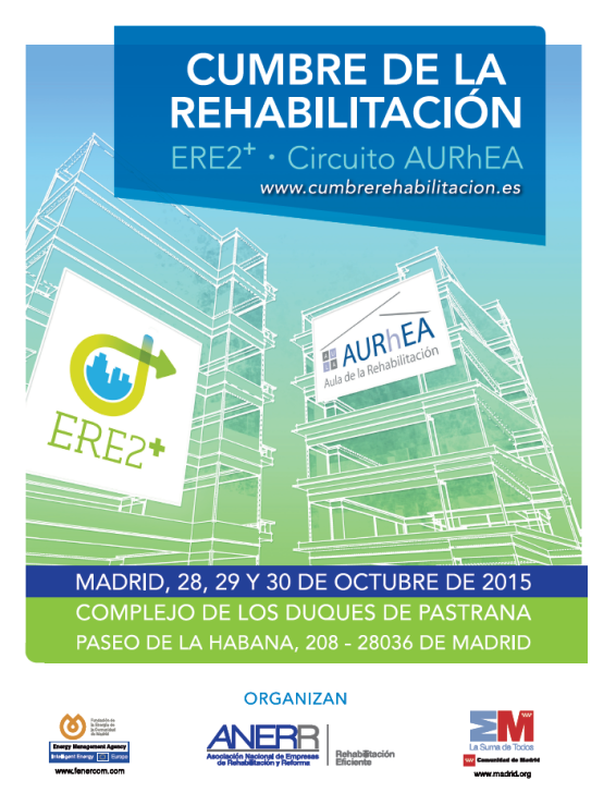 ANERR, Asociación Nacional de Empresas de Rehabilitación y Reforma, junto con la Consejería de Economía, Empleo y Hacienda de la Comunidad de Madrid, a través de la Dirección General de Industria, Energía y Minas y junto con la Fundación de la Energía de la Comunidad de Madrid, FENERCOM, organizan conjuntamente el Circuito AURhEA y el III Congreso sobre Estrategias para la Rehabilitación Energética de Edificios (ERE2+) bajo el nombre de Cumbre de la Rehabilitación. Este gran acontecimiento tendrá lugar los días 28, 29 y 30 de Octubre de 2015 en el complejo de los Duques de Pastrana, situado en el Paseo de la Habana, 208 – 28036 de Madrid.