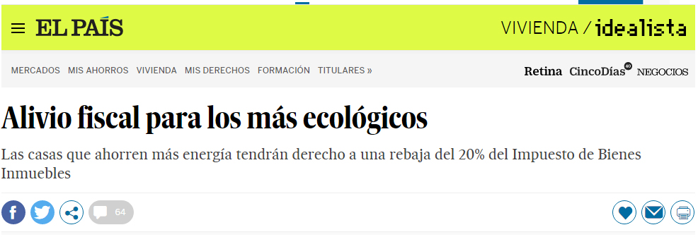 En el día de hoy, el periódico El País, publica en la sección de Negocios «Inmobiliaria y Diseño» un artículo sobre el alivio fiscal para los más ecológicos. Si bien, al final, de momento se ha quedado en una propuesta, es un buen comienzo, a un tema que hay que abordar a la mayor brevedad posible.